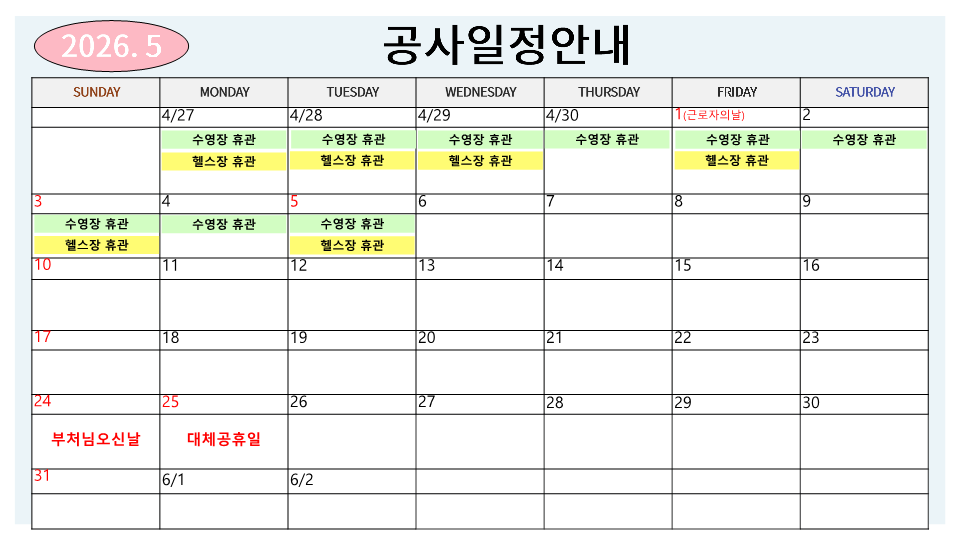 해람스포츠콤플렉스 수영장 방수공사와 관련하여 수영장 및 피트니스 휴관 안내드립니다.